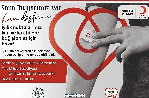 Milas Belediyesi çalışanı ve vatandaşlar, zelzele bölgelerimizdeki acil kan muhtaçlığına katkı sağlamak için ek Hizmet Binasında kurulacak kan bağışı tırı ile kan ve kök hücre bağışında bulunacak.
