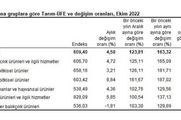 Tarım-ÜFE’de (2015=100), 2022 yılı Ekim ayında bir evvelki aya nazaran 4,59, bir evvelki yılın Aralık ayına nazaran 123,81, bir evvelki yılın …
