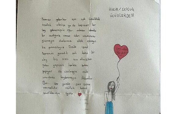 Adana Büyükşehir Belediye Lideri Zeydan Karalar, Efes Selçuk’tan gelen yardım kolilerinden çıkan üçüzlerin yazdığı mektubu toplumsal medya hesabından paylaştı.