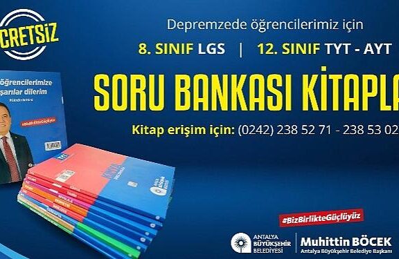 Antalya Büyükşehir Belediyesi zelzele bölgesinden kente gelen gençlerin eğitimine katkı sunmak ve imtihana hazırlanmalarını sağlamak emeliyle eğitim dayanağına devam ediyor. 8 ve 12. Sınıftaki LGS ve YKS’ ye hazırlanan depremzede gençler soru bankası kitaplarına fiyatsız erişebilecek.