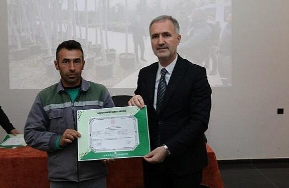 İnegöl Belediyesi’nde Park Bahçeler Müdürlüğü bünyesinde işe yeni başlayan 20 işçiye Kamu Eğitim Merkezi Amel birliği ile Bahçıvanlık Eğitimi Kursu düzenlendi. 186 saatlik eğitimi muvaffakiyetle tamamlayan çalışanlara sertifikaları merasimle takdim edildi.