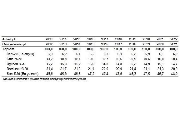 Gelir Dağılımı İstatistiklerinin hesaplandığı Gelir ve Ömür Şartları Araştırması 2022 yılı sonuçlarına ait gelir bilgileri, bir evvelki takvim yılı olan 2021 yılını referans almaktadır. Gelir hesaplamalarında; hanehalkı gelirleri, hanehalkı büyüklüğü ve kompozisyonu dikkate alınarak muadil hanehalkı kullanılabilir Fert gelirine dönüştürülmektedir.