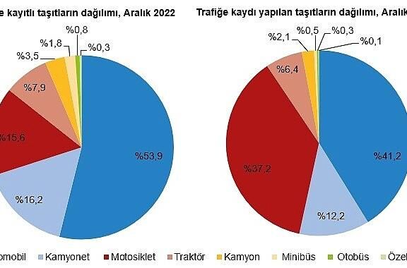 Türkiye’de 2022 yılında bir evvelki yıla nazaran trafiğe kaydı yapılan taşıt sayısı %10,1 artarak 1 milyon 269 bin 912 adet olurken, trafikten kaydı silinen taşıt sayısı %17,1 azalarak 35 bin 585 adet oldu.