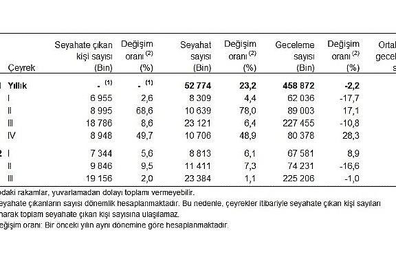 Temmuz, Ağustos ve Eylül aylarından oluşan III. çeyrekte, Yurt içinde ikamet eden 19 milyon 156 bin şahıs seyahate çıktı. Seyahate çıkanların bir ve daha Çok geceleme kaydı ile ülke içinde yaptıkları Yekün seyahat sayısı bir evvelki yılın birebir çeyreğine nazaran %1,1 artarak 23 milyon 384 bin seyahat olarak gerçekleşti.