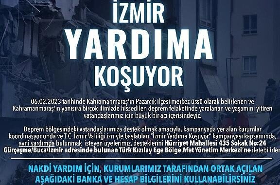 İzmir Amel dünyası, Kahramanmaraş’ın Pazarcık ilçesi merkez üssü olarak belirlenen ve birçok vilayette yıkıma neden olan sarsıntının akabinde “İzmir Yardıma Koşuyor” kampanyasını başlattı.