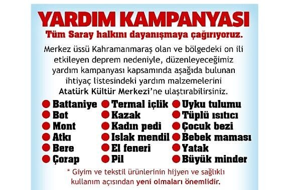 Kahramanmaraş’ın Pazarcık İlçesinde meydana gelen ve Etraf vilayetlerde de şiddetli bir halde hissedilen zelzelenin akabinde Saray Belediyesi, zelzele bölgesi için yardım kampanyası başlattı.