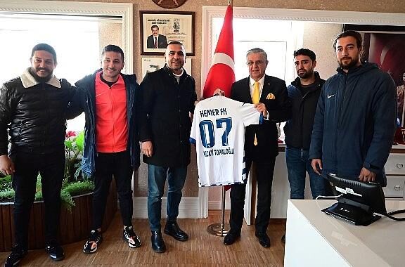 Kemer FK 2020 Lideri Cumali Balık ve kulüp antrenörleri Tayfun Yaz ve Melih Bildiş, Kemer Belediye Lideri Necati Topaloğlu’na nezaket ziyaretinde bulunarak ekibin formasını Armağan etti.
