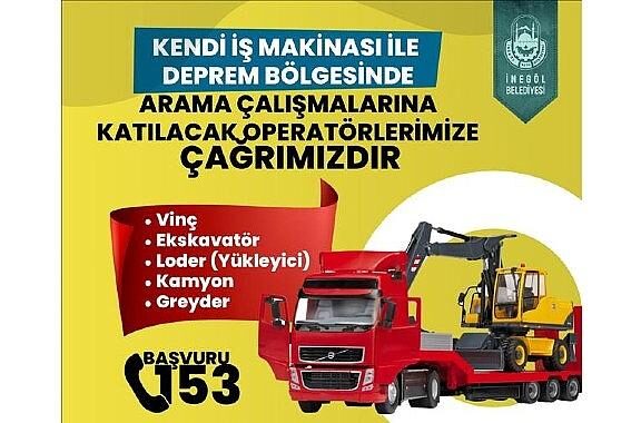 İnegöl Belediyesi, kendi Amel makinası ile zelzele bölgesinde arama kurtarma çalışmalarına katılabilecek Cerrah ve Amel makinası sahiplerine davette bulundu.