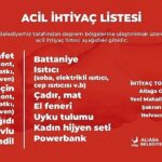 İhtiyaç listesi: Battaniye, Bot, Mont, Atkı, Bere, Çorap, Termal içlik, Kazak, Bayan pedi, Islak mendil, El feneri, Pil, Uyku tulumu, Tüplü ısıtıcı, Çocuk bezi, Bebek maması, Yatak, Aka minder